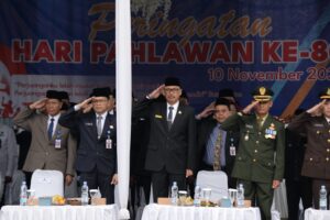 Slawi – Wakil Ketua I DPRD Kabupaten Tegal, Sugono, menghadiri upacara bendera memperingati Hari Pahlawan ke-80 di Taman Makam Pahlawan (TMP) Purakusuma Persada , Desa Kajen Kecamatan Lebaksiu, Senin (10/11).