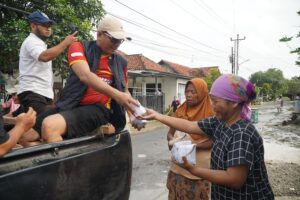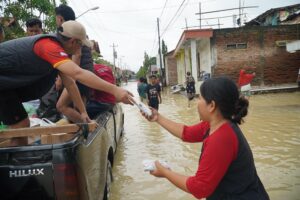 Di tengah genangan yang masih setinggi lutut hingga dada orang dewasa di beberapa titik, Rudi bersama warga turun langsung membagikan lebih dari 1.200 nasi bungkus kepada korban terdampak.