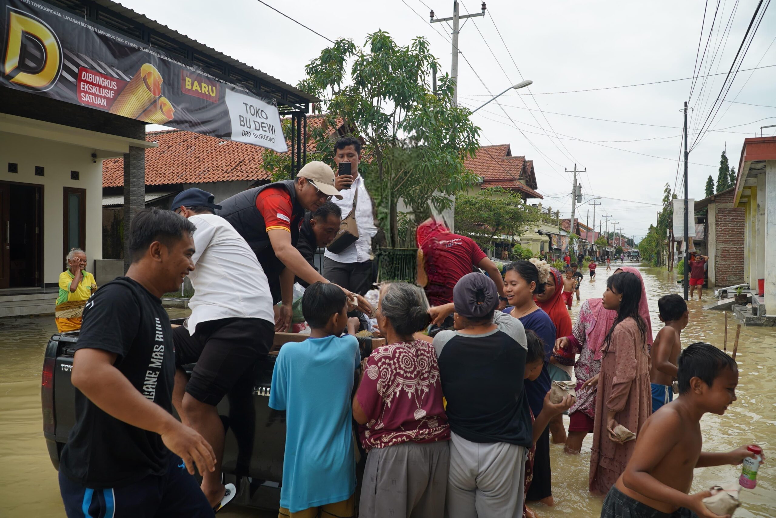 Di tengah genangan yang masih setinggi lutut hingga dada orang dewasa di beberapa titik, Rudi bersama warga turun langsung membagikan lebih dari 1.200 nasi bungkus kepada korban terdampak.