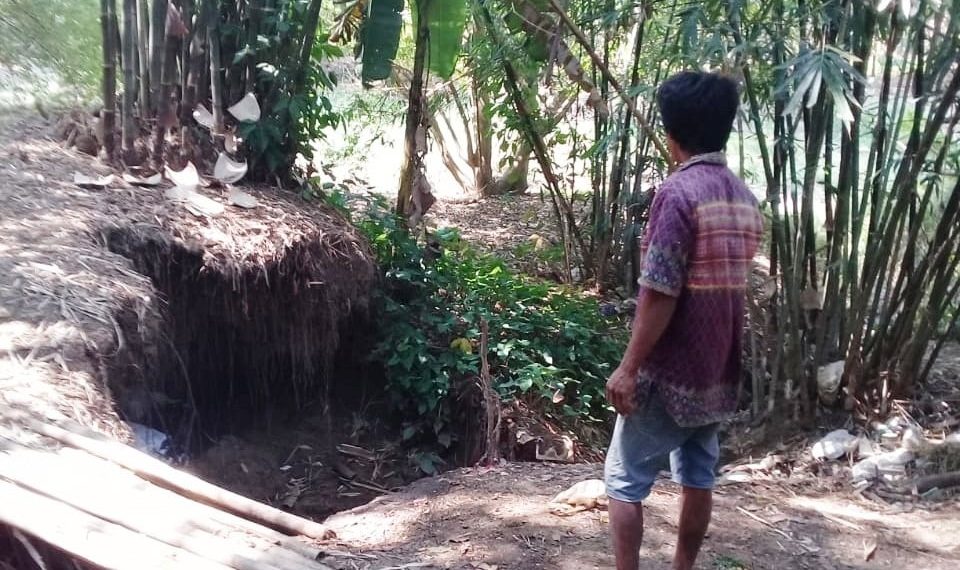 TARUB – Bantaran Sungai Cacaban di Pedukuhan Banjarwaru, Desa Karangjati, Kecamatan Tarub, Kabupaten Tegal, longsor sejak beberapa waktu lalu. Longsor yang disebabkan gerusan air sungai itu, mengancam sejumlah rumah dan lahan perkebunan di wilayah tersebut.